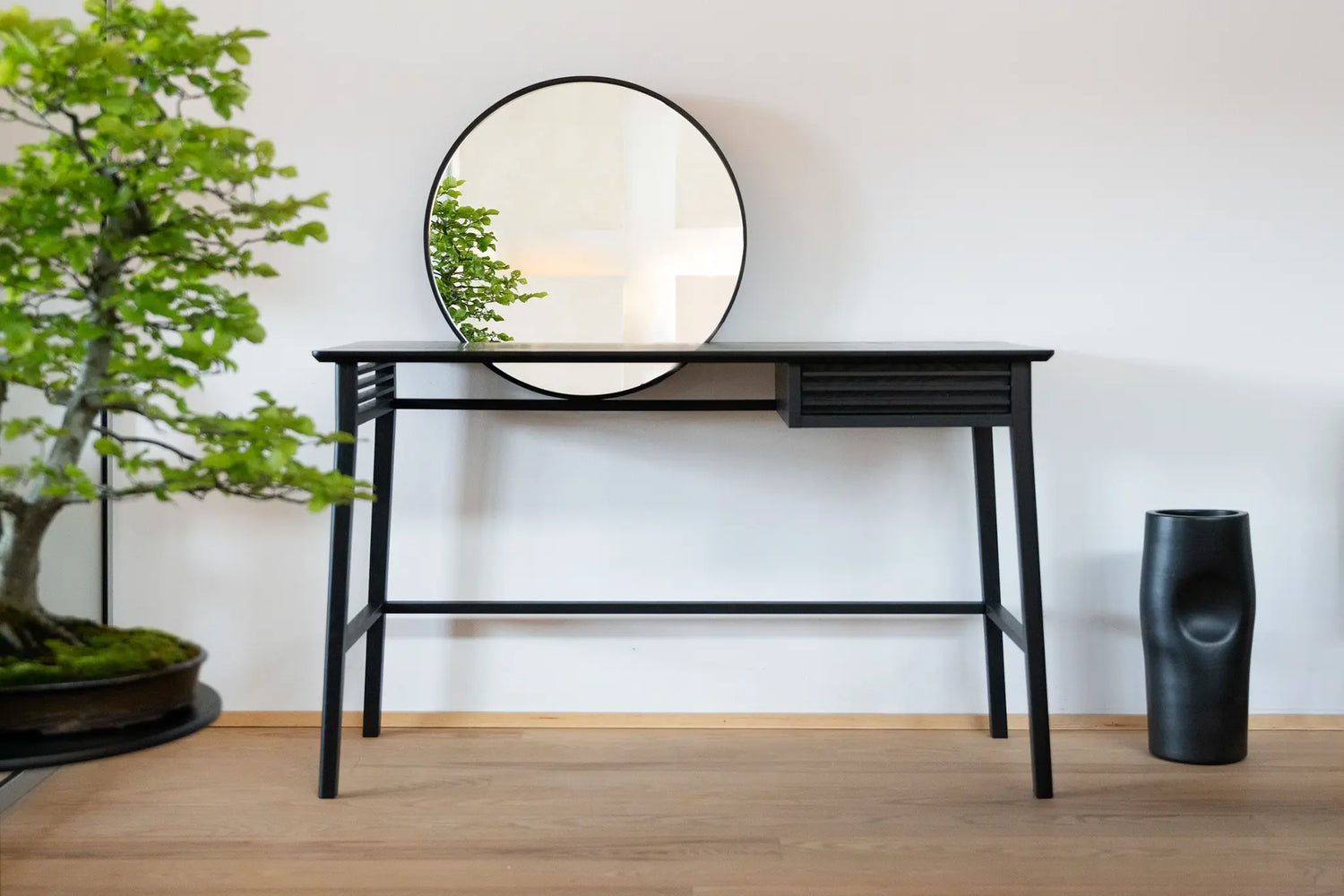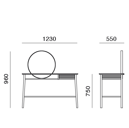 Hinode, which translates to "sunrise“ in Japanese, is a dressing table designed by Monica Förster Design Studio. This piece encapsulates the minimalistic and poetic essence shared by Scandinavian and Japanese aesthetics. The round mirror emerges from the surface of the table, reminiscent of the sun rising from the sea. Its proportions delicately balance structural strength with visual lightness, evoking the fluidity of calligraphy in its silhouette.