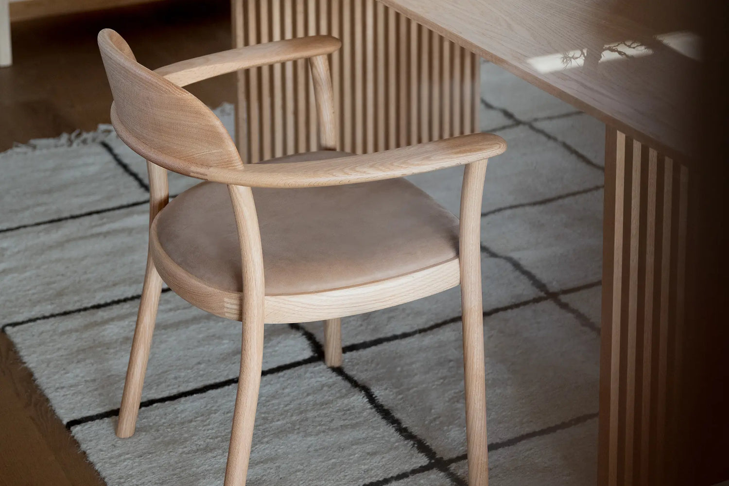 The Koi chair is a dining armchair designed by Gabriel Tan. The chair features a generous backrest, with organic armrests shaped like the curved body of a Japanese carp, hence its name. The designer’s vision is a solid wood dining chair that is extremely comfortable, one that showcases the craftsmanship of Ariake and being suitable as both a dining chair and home office chair, as our homes and workspaces have evolved to become more hybridized today.