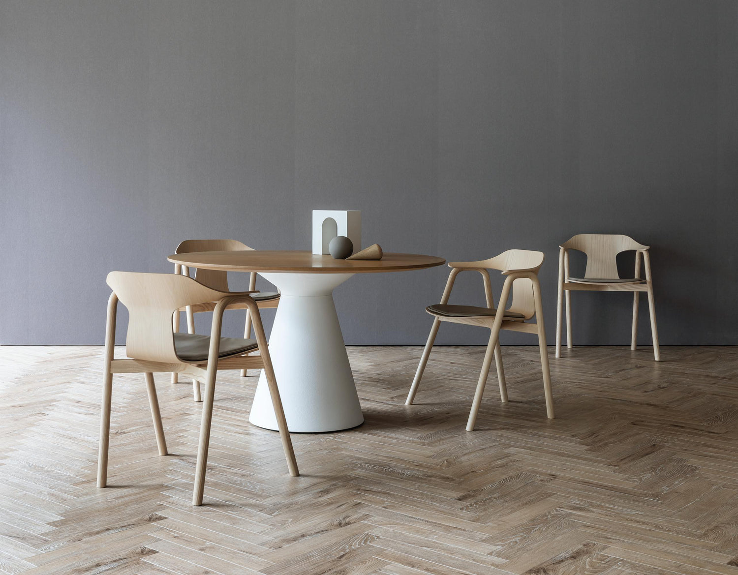 A circular table that strikes a beautiful contrast between its single massive diecast leg and its thin top. The leg’s conic shape leaves plenty of room for matching various chairs with the table. The top is available in solid wood, five distinctive choices of marble, or the ultraceramic DEKTON.