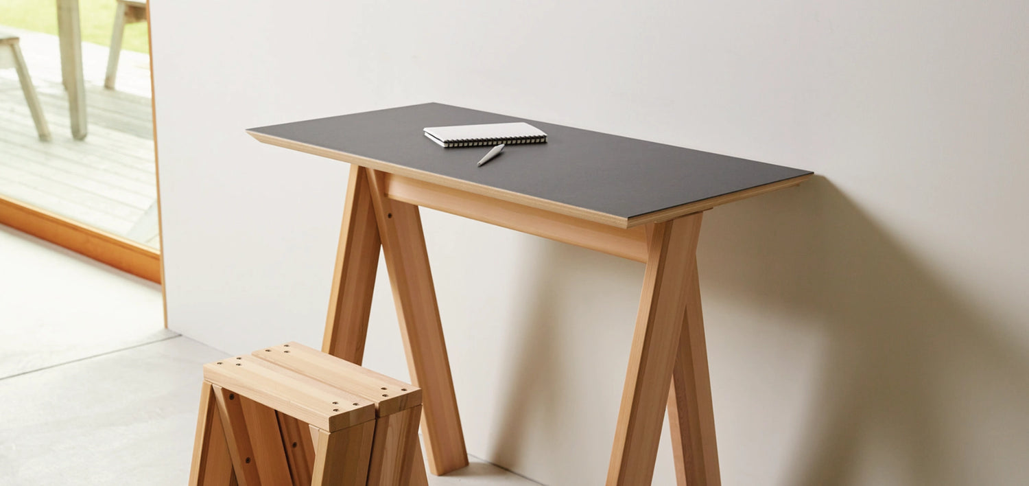 Made from dimensional lumber, the AA DESK is the next step in the development of the AA STOOL series. The edges of the tabletop have been tapered so as to highlight the legs of the desk, which have inherited the iconic AA frame. Made of natural ingredients, the linoleum tabletop has a soft texture yet remains durable against dirt. It is easy to move around, making it a suitable personal desk.