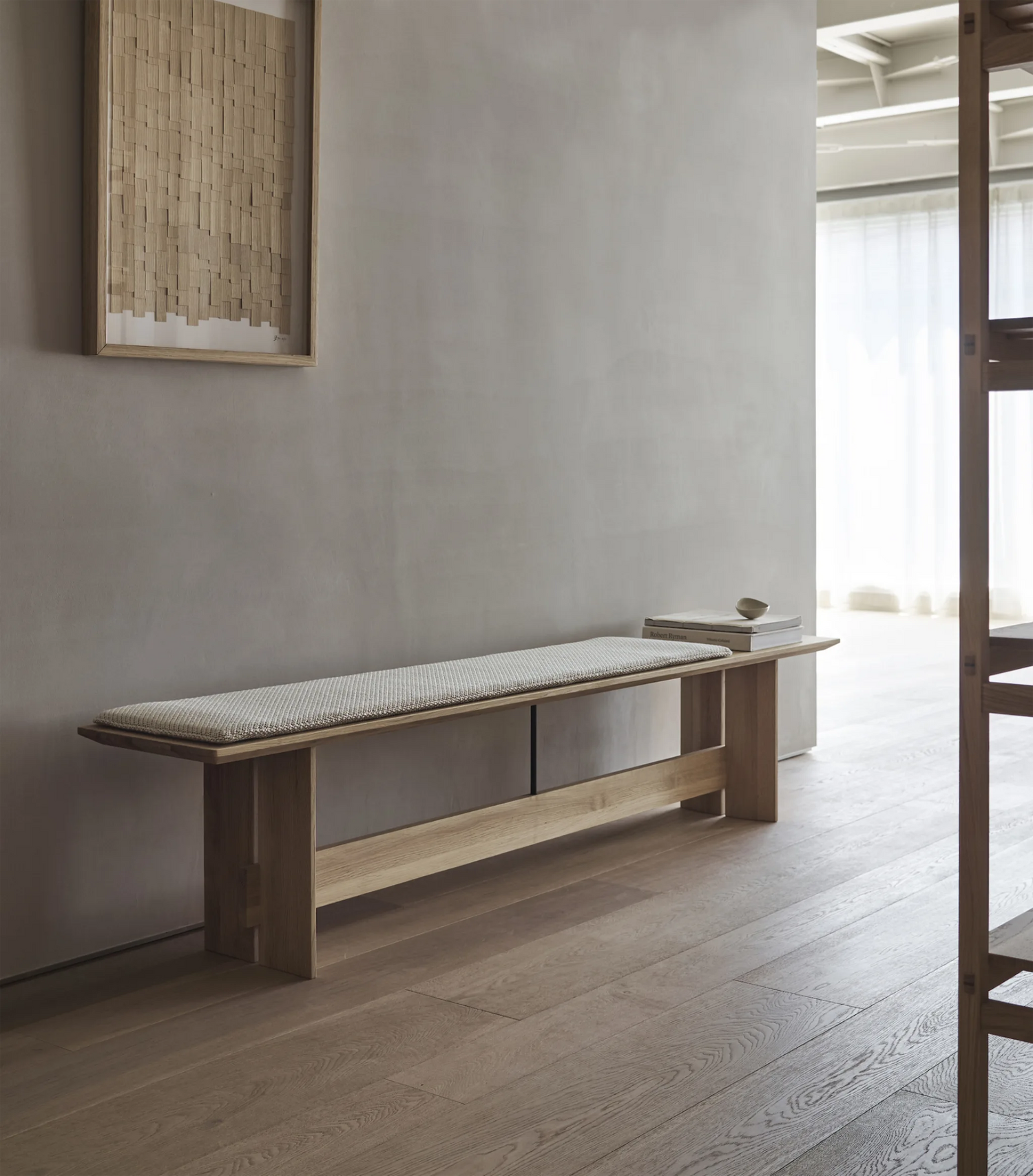 The A-B01 bench was designed to accommodate the need for a multi-purpose piece, both comfortable used for seating but with aesthetic capabilities befitting a display stand. The thin edges of the seat and legs give the piece a light and exclusive appearance while the transverse strut connected to the seat with a delicate steel rod, ties the construction together visually and functionally, creating a sense of overall harmony. A dedicated cushion is also available separately.