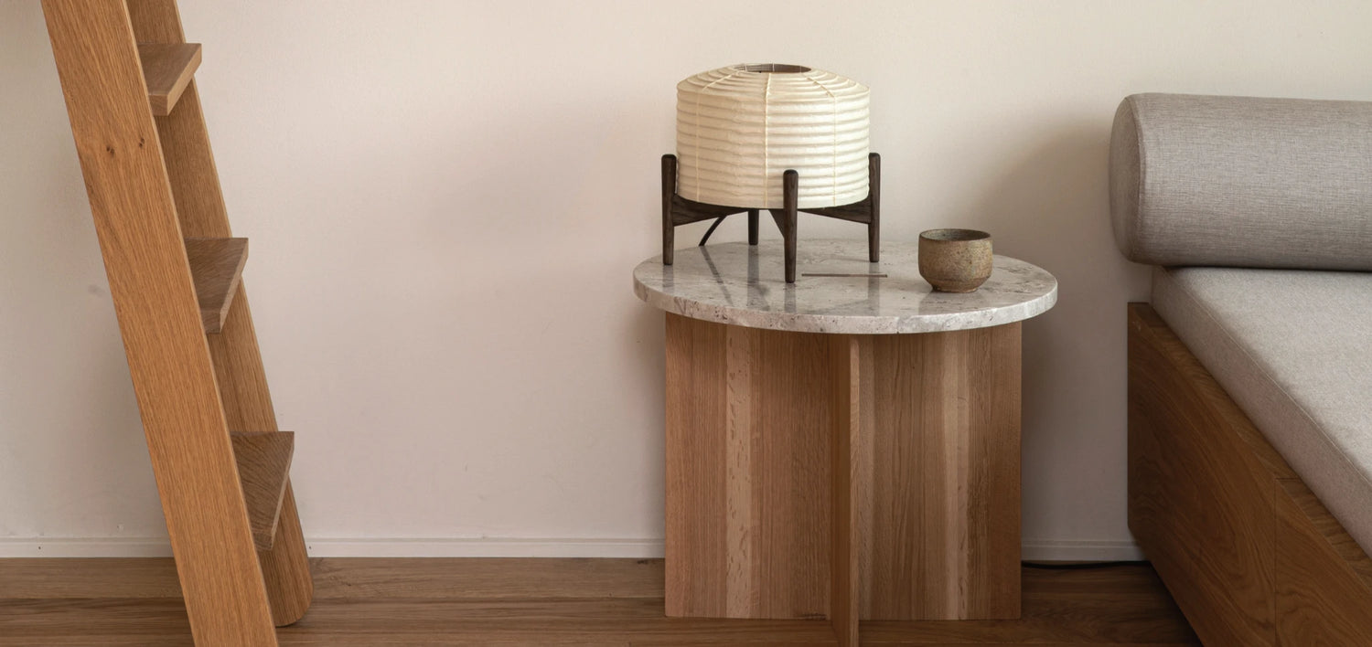 With its construction being based on the many facades and doors that you find in shrines, temples and traditional architecture all over Japan, the various wooden parts of the sofa table are intentionally spaced and levelled with high precision, making the furniture piece light in its appearance. The spacing between each element lets the light travel through to make for an organic, living piece of furniture. The stone top carries references to the minimalist designs by famous, Danish designer Poul Kjærholm.