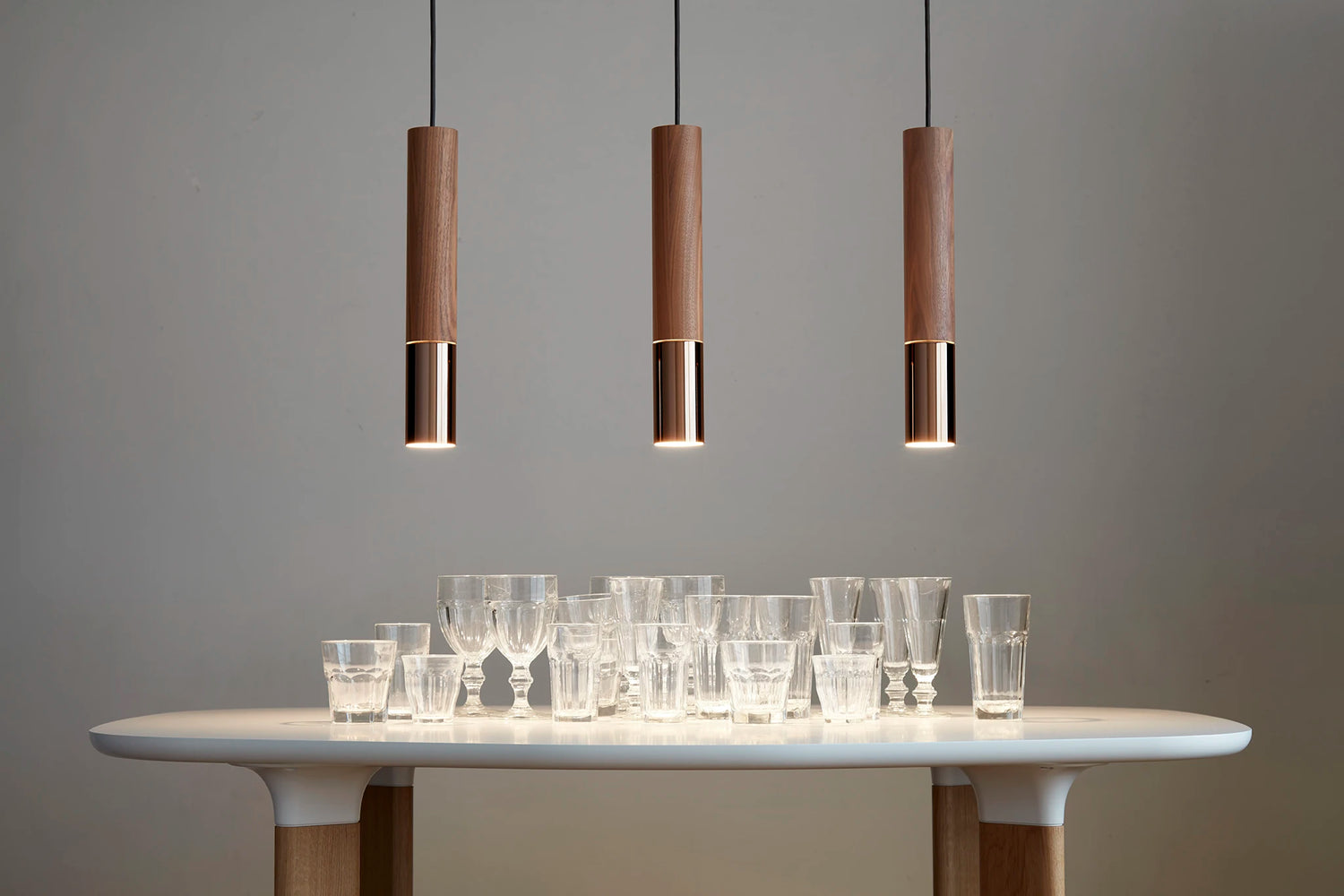 CREA features a minimalist cylinder and a combination of different materials―wood and metal. Within its sophisticated simple slender design, the gentle light shining out of the slit brings elegance to the atmosphere even more.