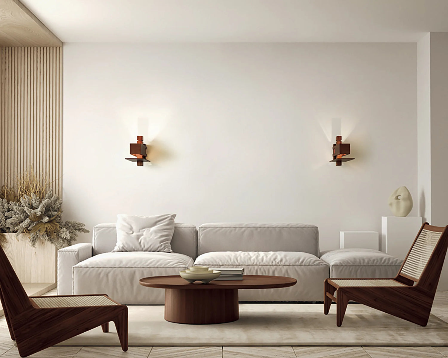 Inspired by a pendant lamp designed by Frank Lloyd Wright in 1933 when he converted the Hillside Home School gymnasium into a theater, the TALIESIN WALL SCONCE embodies his masterful approach to lighting. The interplay of multiple wooden blocks controls the upward and downward illumination, while the light reflects off the shades, creating a warm and inviting atmosphere.