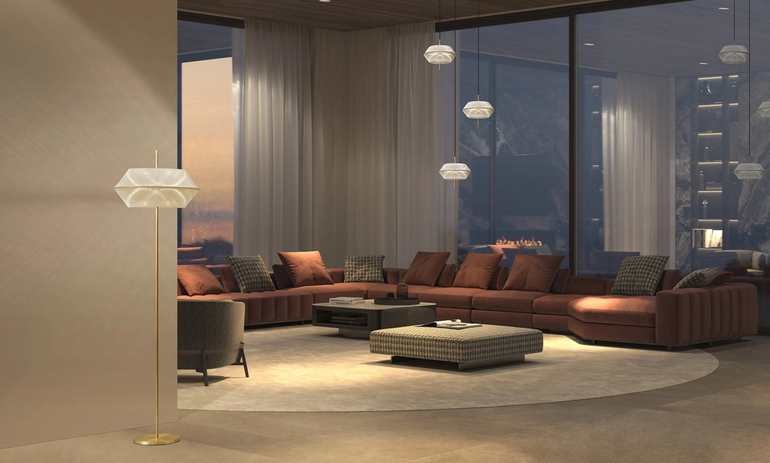 TWILIGHT is an exquisitely designed lighting series inspired by the twilight sky, where the sun gracefully sets below the horizon. The light diffuses from the shade, meticulously crafted from glass fibres, imparting a radiant brilliance reminiscent of a crystal chandelier, and evoking the warm hues of a sunset.