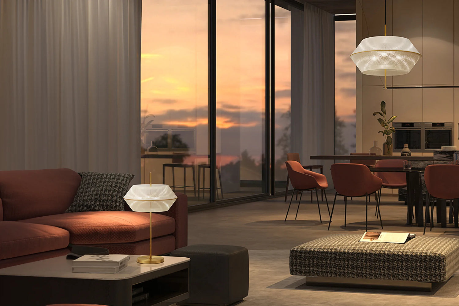 TWILIGHT is an exquisitely designed lighting series inspired by the twilight sky, where the sun gracefully sets below the horizon. The light diffuses from the shade, meticulously crafted from glass fibres, imparting a radiant brilliance reminiscent of a crystal chandelier, and evoking the warm hues of a sunset.