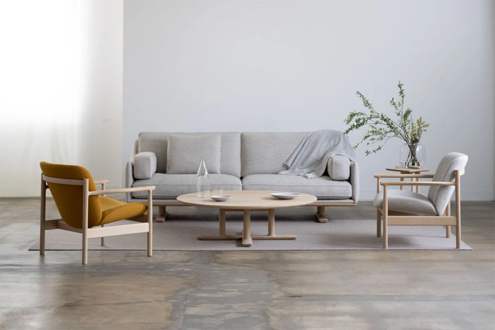 The tabletop has a slightly bulging barrel shape in the center. When seated, it tilts slightly inward, making it easy to make eye contact and engage in conversation with others. The legs, inspired by tree branches, feature a light and charming design. This table pairs well with relatively casual chair designs. We offer a wide range of custom sizes. Compatible with three wood species: oak, beech, and black walnut.
