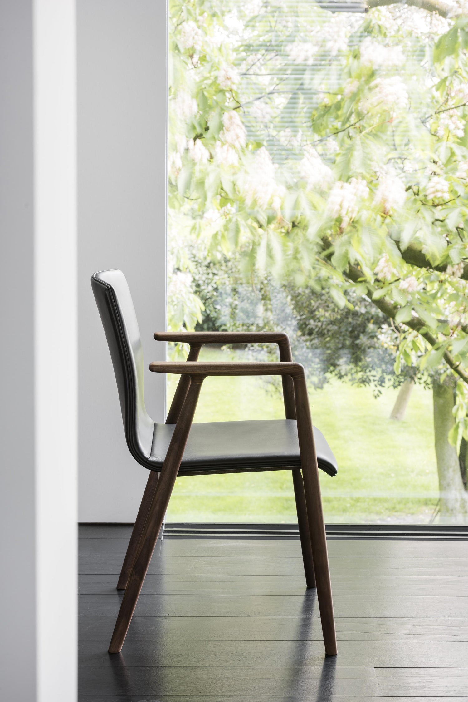 The frame of Gina is very slender, but various innovations have ensured a sturdy structure. The seat and back are upholstered and moulded ( plywood laminated in orthogonal fibre directions) in one piece, with the right degree of elasticity to make sitting on Gina very comfortable. The shell-shaped backrest is developed to embrace the body and to create the right amount of flexion for supple seating comfort. The arms have a firm, stable feel and support the body well. They are gradually thickened from the front, making them very easy to grip when standing or sitting down. By separating the parts of the backseat and frame, there is an appropriate amount of space around the shell, which gives Gina a light image despite its strength.