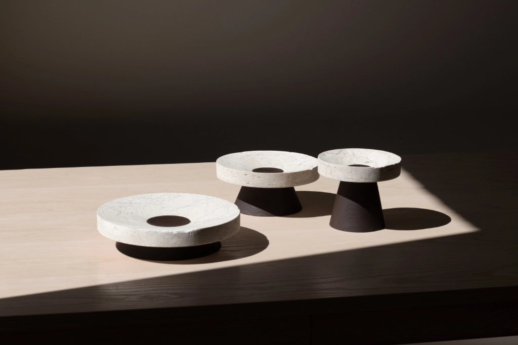 The Coliseu Pedestals designed by Gabriel Tan, with the roman travertine tray made by Ricardo Eira and the smoked ash base made by Carlos Barbosa, are inspired by the amphitheatres of ancient Rome. The gently concave part of the wooden base matches seamlessly with the slope of the travertine tray, resulting in an object that is a functional sculpture combining two noble materials we love. The natural qualities of travertine stone could present certain cavities and color variations.