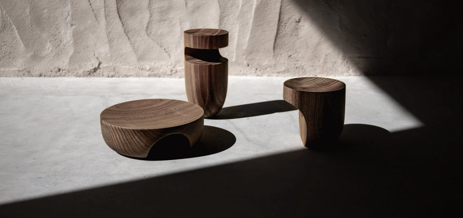 When we envisage turned wood objects, they tend to be symmetrical in form and often used as bowls, cups, or canisters for storing tea leaves. Turned wood objects are beautiful and utilitarian, but they could also be philosophical and poetic at the same time. Using carved voids, the idea was to disrupt the symmetrical beauty of these turned wood forms, giving birth to new and unexpected compositions. The outcome is a study of positive and negative space, and dialogue between three haptic volumes which serve as small sculptures. Each Void Sculpture has a gently concave surface to serve as a pedestal for displaying our most precious small items.