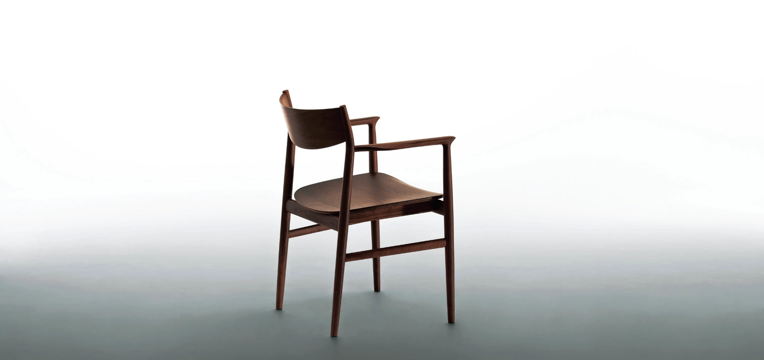 The pleasant seating experience of the Kamuy dining arm chair is realized by the wide, deep seating and the rounded back. By utilising advanced cutting methods, the craftsmen are able to highlight the beautiful natural wood grains on the generous back and most visually prominent area of the chair. The timber seat is three dimensionally carved from jointed solid timber. The slightly rounded contours and tapered edges throughout the entire collection creates a soft yet sleek profile.