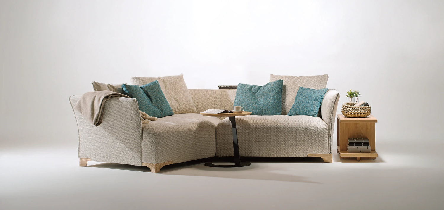 This sofa presents a new concept suggesting to "embrace wrinkles" along with its beautiful styling that weaves together edges and curves. Designed by Toshiyuki Yoshino, it serves as a place to relax for extended periods rather than just a seating arrangement. The spotlight is on the "L-shaped" type as the central focus, with modular parts allowing for customizable configurations based on space and purpose. A significant feature lies in the cushion design, embodying Yoshino's envisioned story of "welcoming without resistance, gently sinking in, and providing firm support."