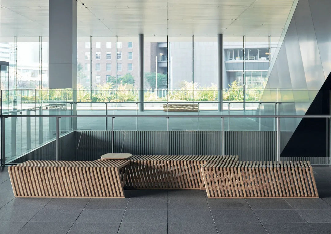The wooden bench is the icon of the NAKKA series. Thin wooden linear components are assembled into an inverted U-shape, and the leg ends are tilted in opposite directions to form one part, some pieces of which are then connected to form a "transparent volume.When viewed from above, the inverted U-shaped component reveals the letter "N" for Nakanoshima Museum of Art, which became the design motif for this series. Along with its comfortability as a utilitarian object, the bench has many expressions that can be seen from different angles, giving it a sculptural aspect as well.