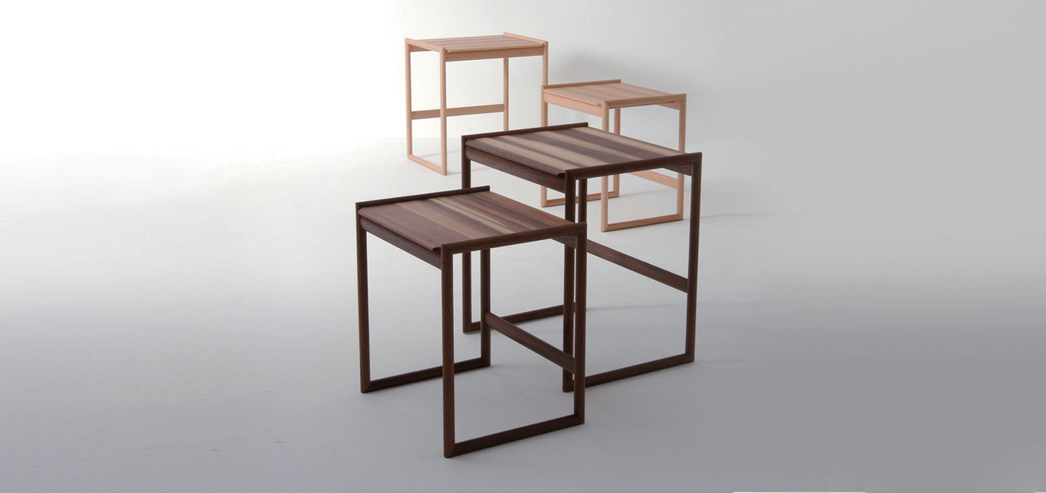 The "NEST TABLE" is a set of slim and simple side tables available in different sizes. When not in use, they can be nested together, saving space. The tabletop is made of beech solid wood, utilizing the contrasting colors between the heartwood and sapwood to create a unique design that highlights the characteristics of the wood.