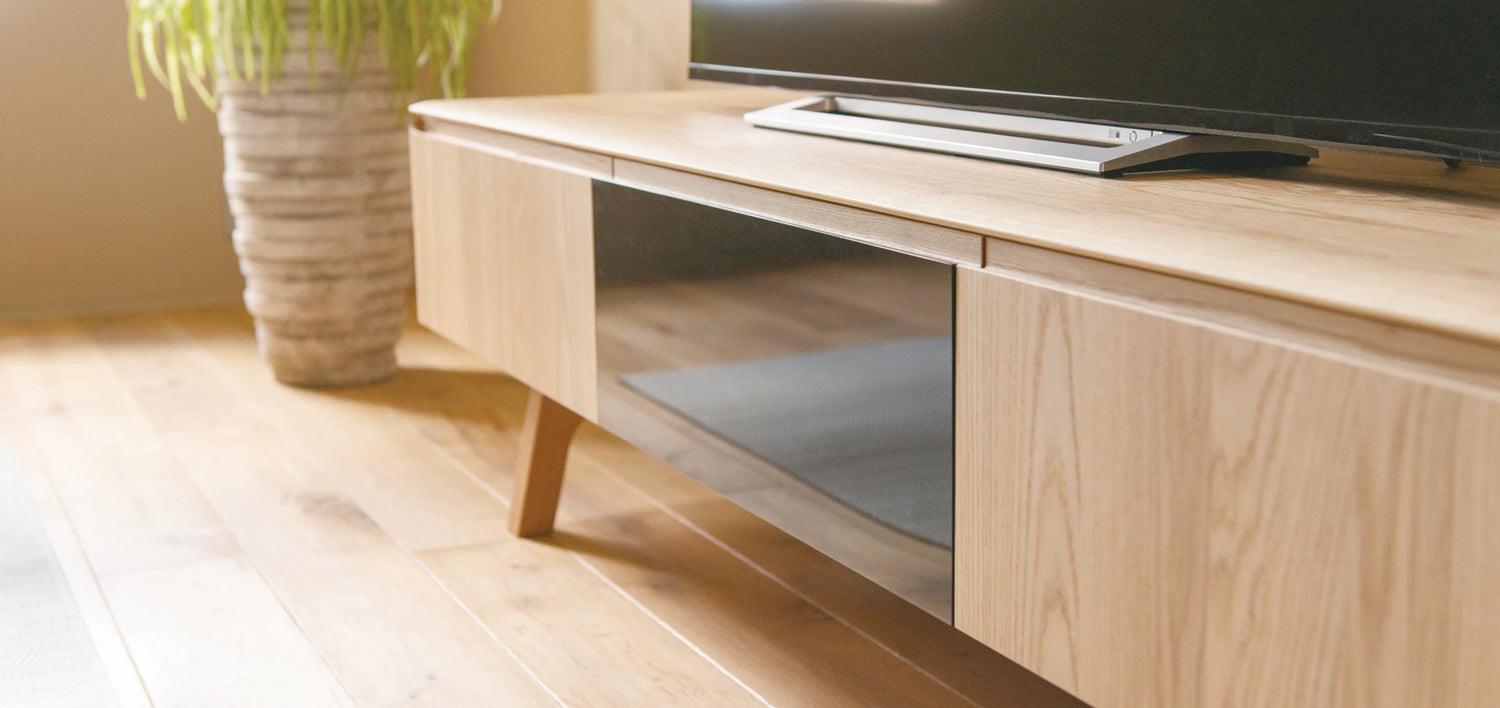 Designed to convey a sense of floating with minimalistic features that suit modern lifestyles. Unlike box-type floor-standing models, it extends all the way to the back, offering a stylish design without feeling cramped. With a height of 135mm from the floor, it allows for passage of a vacuum cleaning robot. Equipped with a removable back panel, allowing for neat storage of cables and cords of AV equipment. Both the left and right drawers, as well as the central flap door, are meticulously designed to balance sharp aesthetics with functionality, paying attention to even the smallest details. The tabletop is available in solid wood, matching the main body, and also comes in colored finishes (white, dark gray, black, red). This offers versatility in style options.