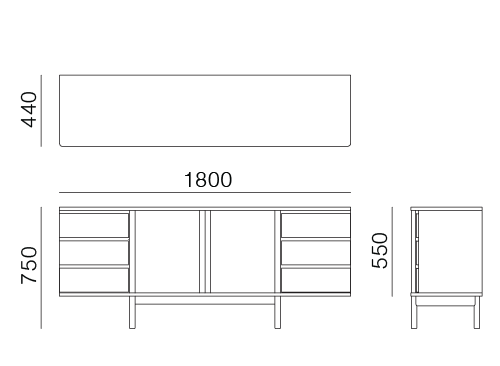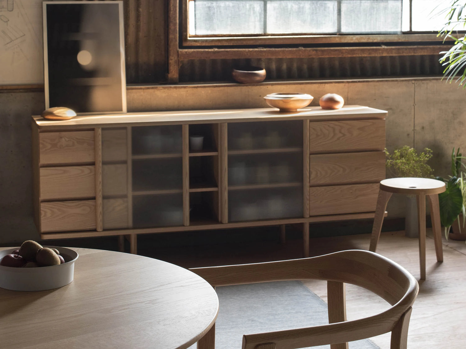 The design of the Rikyu sideboard draws inspiration from the architectural elegance of traditional Japanese homes, characterized by raised wooden stilts and sliding tatami doors. Each element of the sideboard, from its handles to its legs, is meticulously aligned to mirror the precision and harmony emblematic of Japanese architectural principles. This alignment is particularly evident when the glass doors of the console are fully opened or closed, emphasizing the meticulous attention to detail inherent in Japanese design aesthetics.
