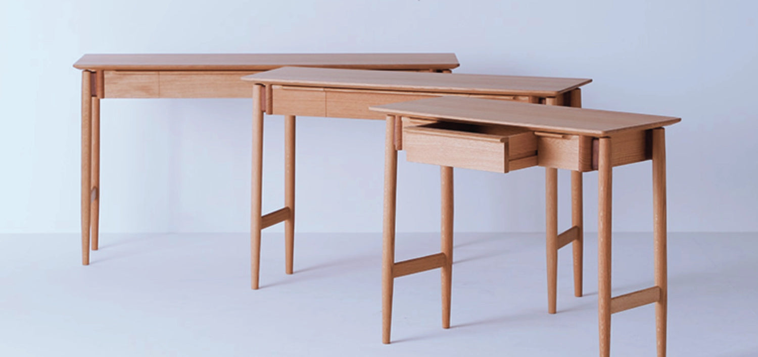 This desk features a slim design with a depth of 400mm, incorporating a craft-inspired feel that highlights the texture of oak wood. It's easy to move around, allowing you to use it in different areas of the room depending on your mood or needs. Equipped with drawers for storing stationery and other items. When placed at the end of a dining table, the W850mm size extends the tabletop, providing space for placing pots and other food items, making it useful when you have guests. It can also be placed behind a sofa for telecommuting in the living room, or positioned against a wall to create a high-quality workspace and add sophistication to your interior decor.